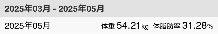 5月の平均はこんな感じ。ちなみに体重はほぼ毎日測定しております。