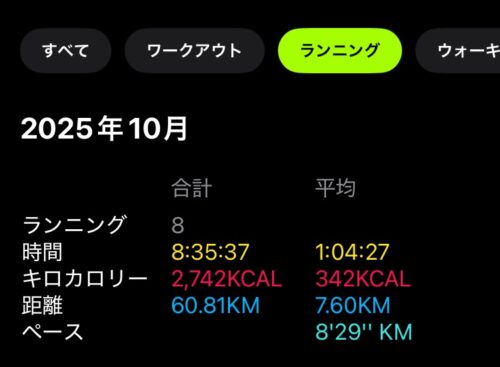 15日で何キロ走れるかな? ボディメイク X Facebook はてブ Pocket LINE コピー 2025.10.15 Apple Watchは今月何キロ走ったか分かるのです。 10月は合計距離は60.81kmと出ています。 腰痛もあったので初心者には良いペースです。積み重ねです。 1キロ痩せるには7200キロカロリー必要だとのこと。1ヶ月に1キロ痩せるのは私のペースでは難しいようです。 たくさん走ると足の疲労が出るのであまり無理は出来ません。ゆっくりといきましょうか?
